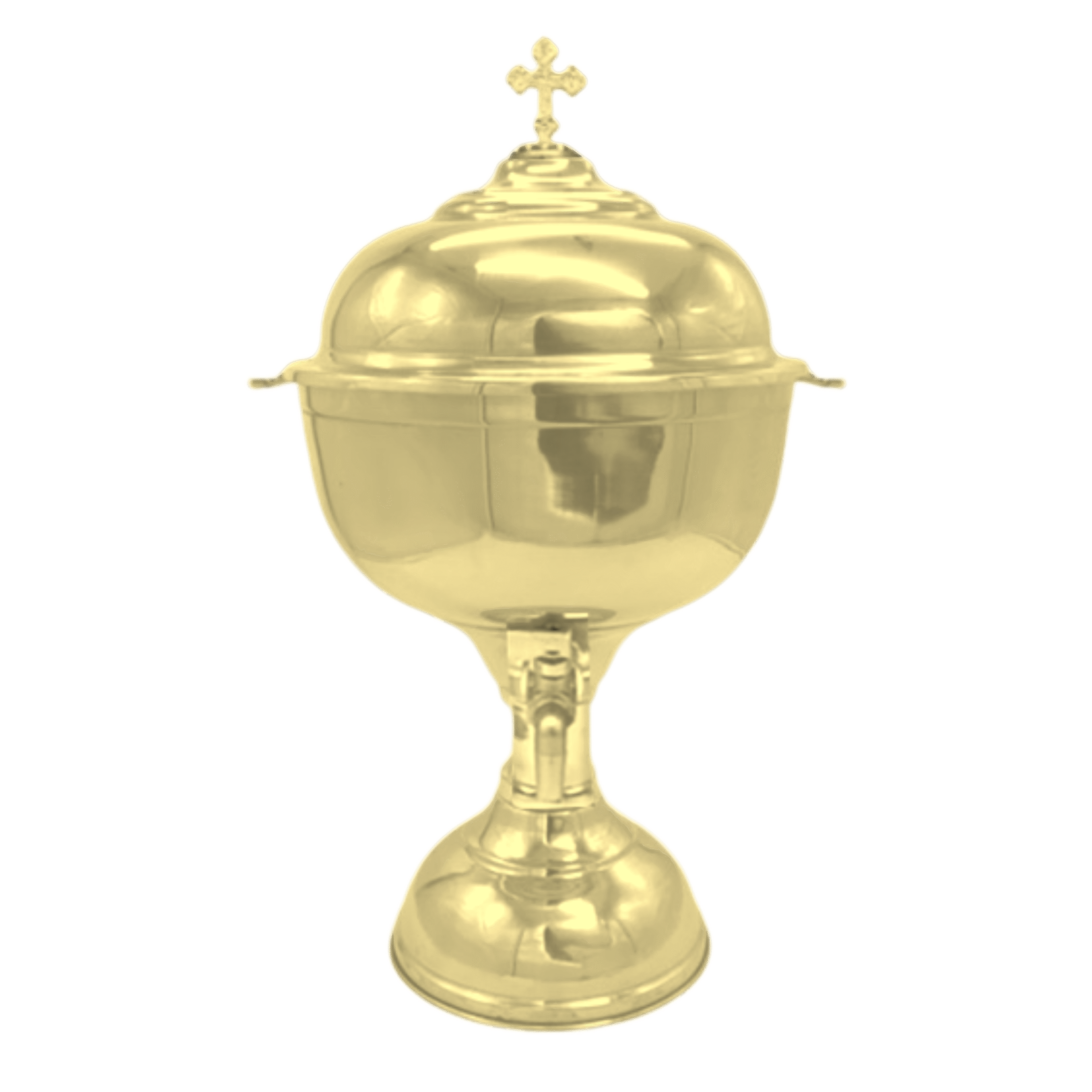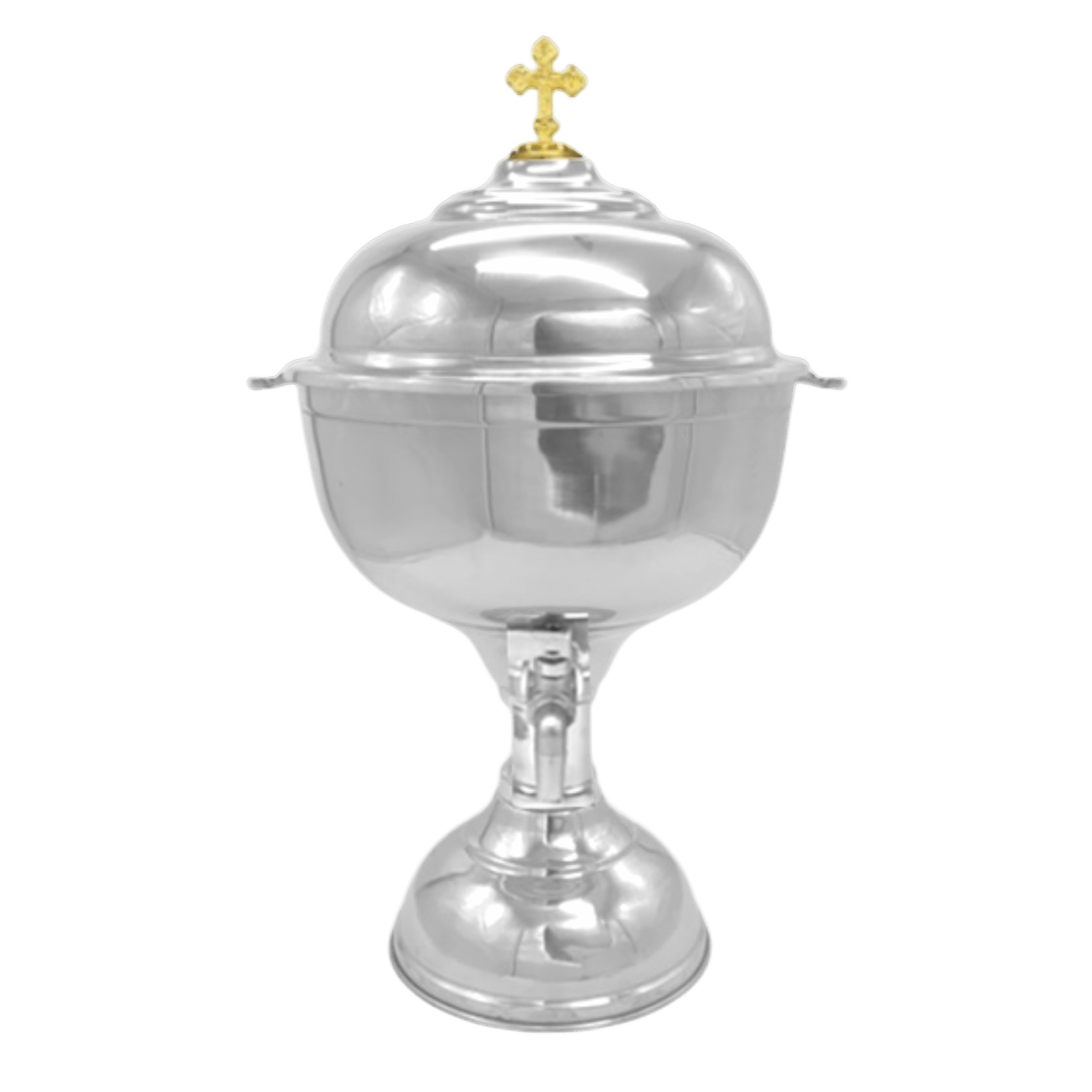 Κολυμβήθρα αγιασμού 9 λίτρων με καπάκι. Διατίθεται δυνατότητα επιλογής χρώματος μεταξύ χρυσού και ασημί, ώστε να προσαρμόζεται κατάλληλα στις ανάγκες σας.