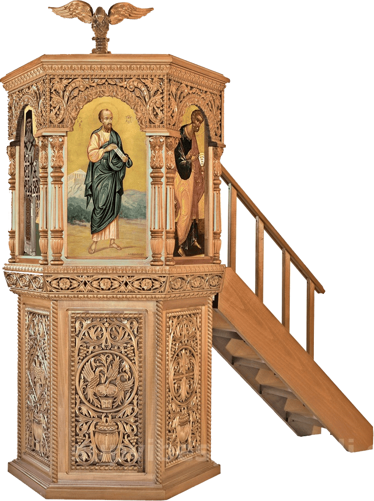 Ξυλόγλυπτος άμβωνας επιδαπέδιος, σκαλιστός με υψηλή τεχνοτροπία. Ιδανικός για εκκλησίες, προσφέρει κομψότητα, αξιοπρέπεια και μοναδικό σχεδιασμό που αναβαθμίζει τον χώρο του ναού σας.