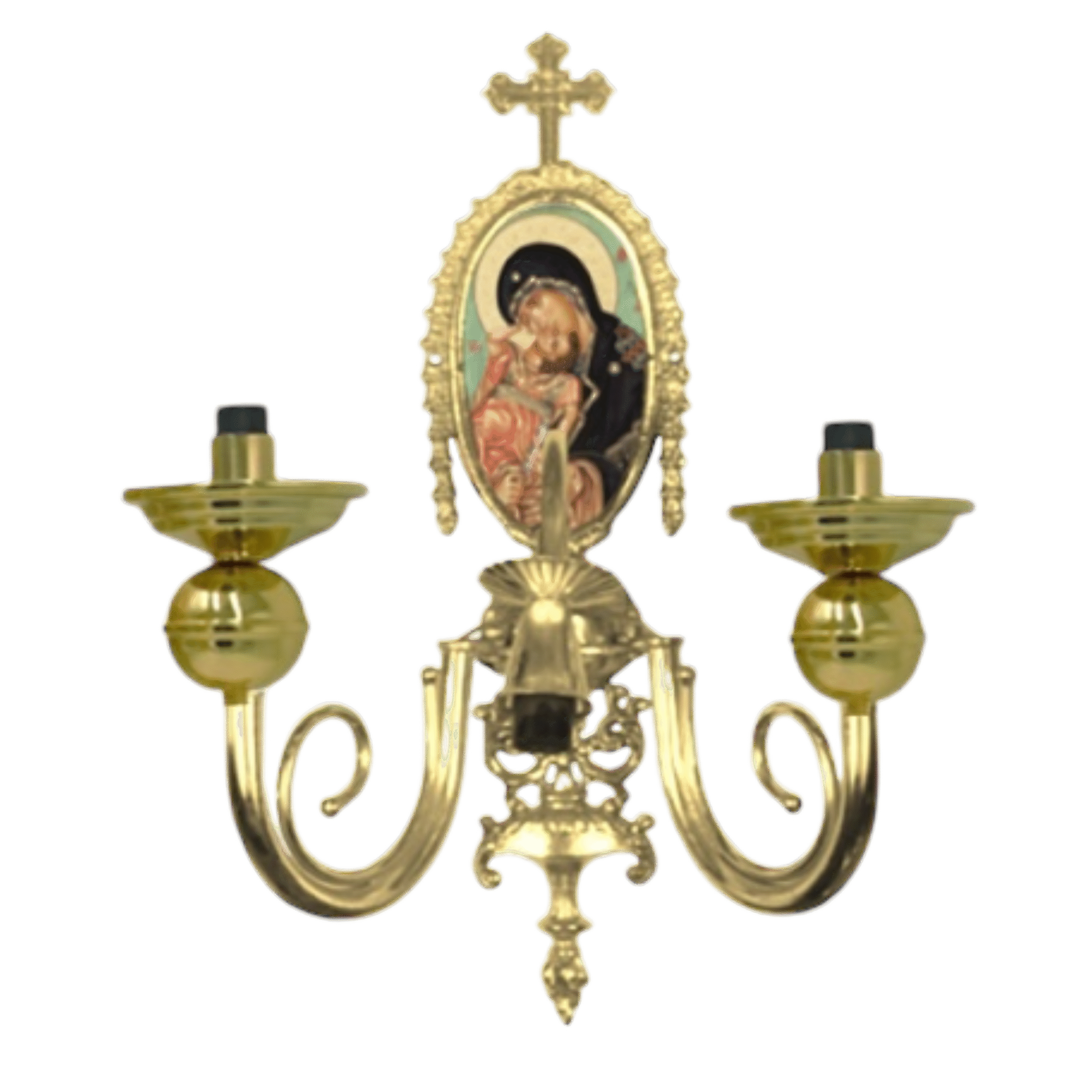 Απλίκα σε χρυσό χρώμα με 2 φώτα και εικόνα της Παναγίας.