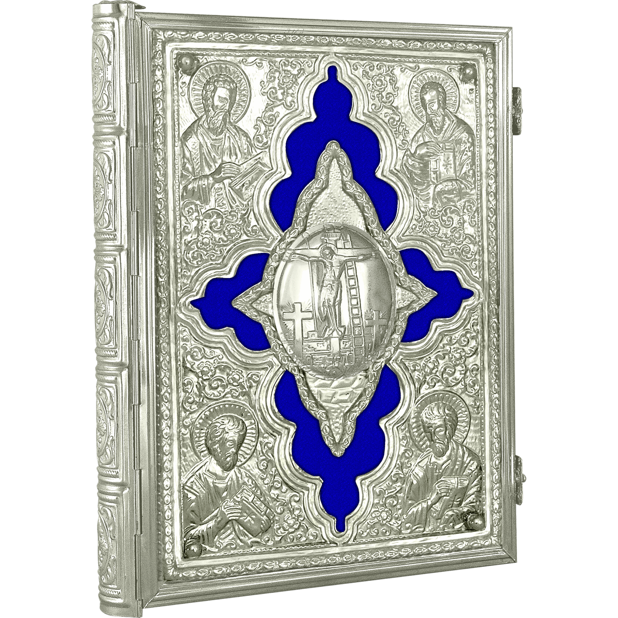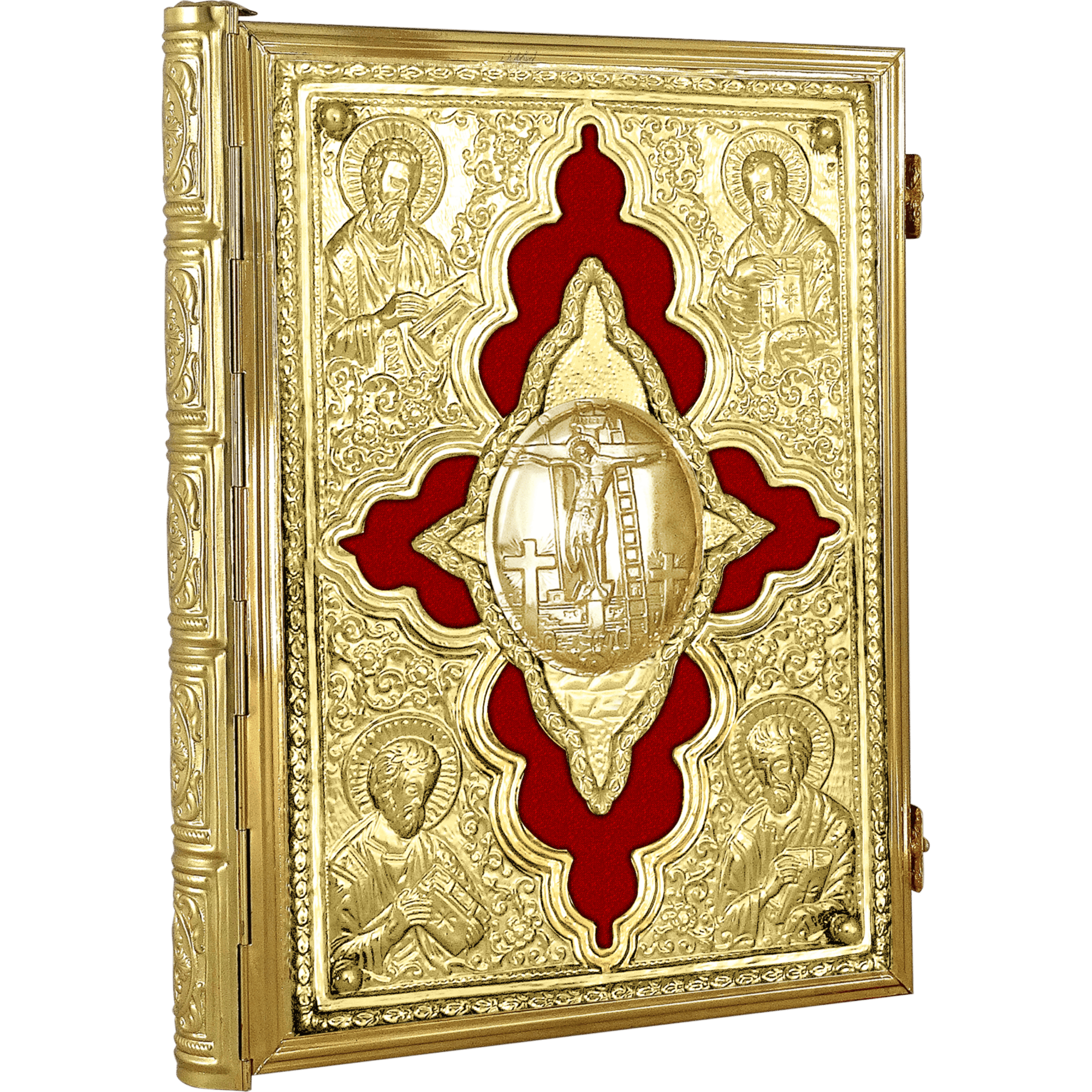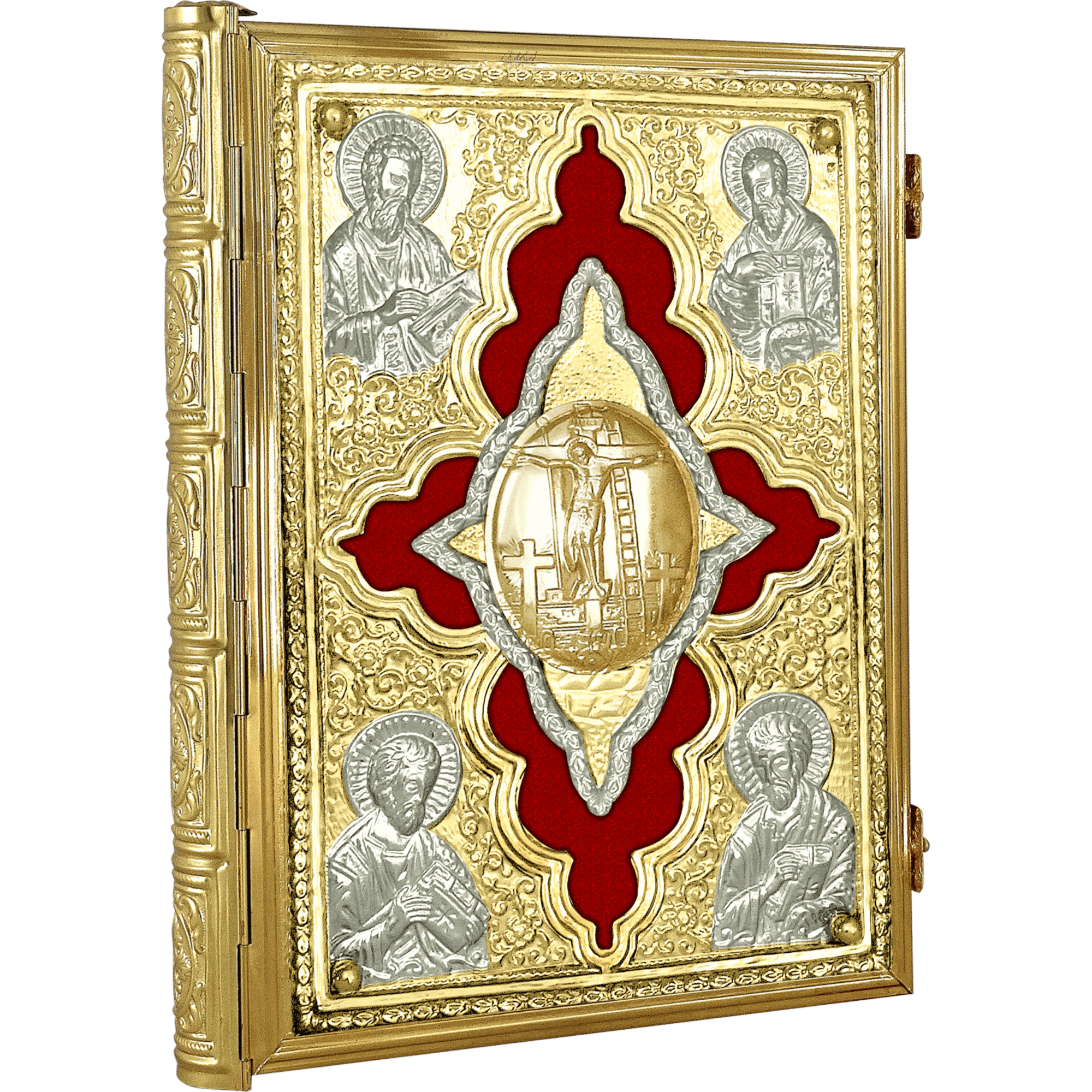 Μεταλλικό ευαγγέλιο, διακοσμημένο με μοναδικά σκαλίσματα και κόκκινη λεπτομέρεια στο κέντρο. Διατίθεται δυνατότητα επιλογής χρώματος μεταξύ χρυσού, ασημί και διχρωμίας χρυσό – ασημί, ώστε να προσαρμόζεται κατάλληλα στις ανάγκες σας.