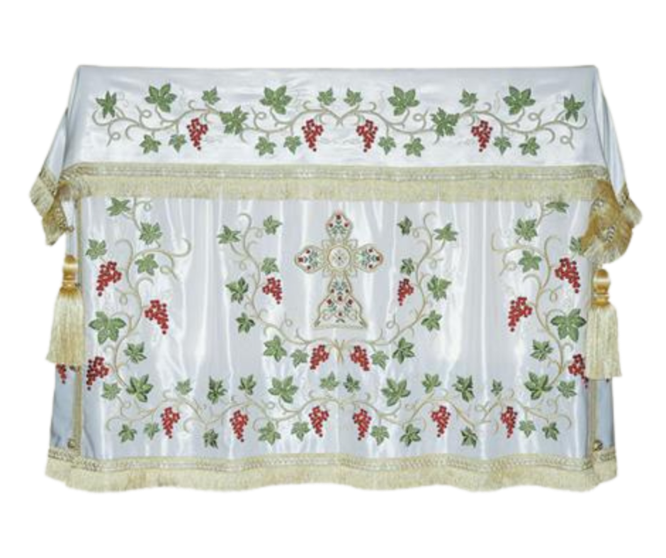 Υφασμάτινο κάλυμμα Αγίας Τράπεζας με χρυσοκέντητες λεπτομέρειες με χρυσοκλωστή και σχέδια εμπνευσμένα από την εκκλησιαστική παράδοση. Επικοινωνήστε για διαθεσιμότητα χρωμάτων και διαστάσεων.