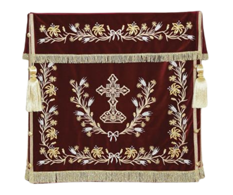 Υφασμάτινο κάλυμμα Αγίας Τράπεζας με χρυσοκέντητες λεπτομέρειες με χρυσοκλωστή και σχέδια εμπνευσμένα από την εκκλησιαστική παράδοση. Επικοινωνήστε για διαθεσιμότητα χρωμάτων και διαστάσεων. Ιδανικό για εκκλησίες και μοναστήρια, συνδυάζει ανθεκτικότητα, κομψότητα και μοναδικό σχέδιο που προσαρμόζεται τέλεια στις ανάγκες σας.