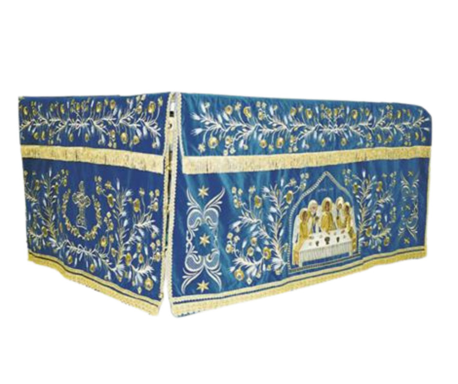 Υφασμάτινο κάλυμμα Αγίας Τράπεζας με χρυσοκέντητες λεπτομέρειες με χρυσοκλωστή και σχέδια εμπνευσμένα από την εκκλησιαστική παράδοση. Επικοινωνήστε για διαθεσιμότητα χρωμάτων και διαστάσεων. Ιδανικό για εκκλησίες και μοναστήρια, συνδυάζει ανθεκτικότητα, κομψότητα και μοναδικό σχέδιο που προσαρμόζεται τέλεια στις ανάγκες σας.