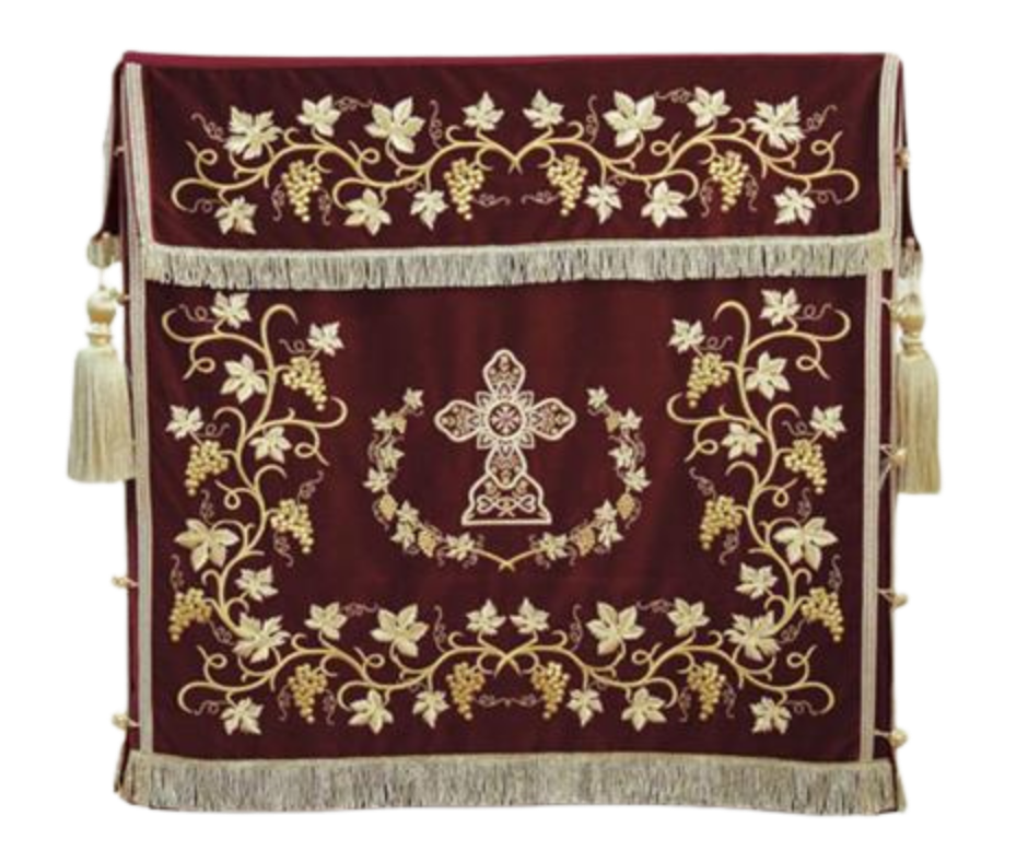 Υφασμάτινο κάλυμμα Αγίας Τράπεζας με χρυσοκέντητες λεπτομέρειες με χρυσοκλωστή και σχέδια εμπνευσμένα από την εκκλησιαστική παράδοση. Επικοινωνήστε για διαθεσιμότητα χρωμάτων και διαστάσεων. Ιδανικό για εκκλησίες και μοναστήρια, συνδυάζει ανθεκτικότητα, κομψότητα και μοναδικό σχέδιο που προσαρμόζεται τέλεια στις ανάγκες σας.