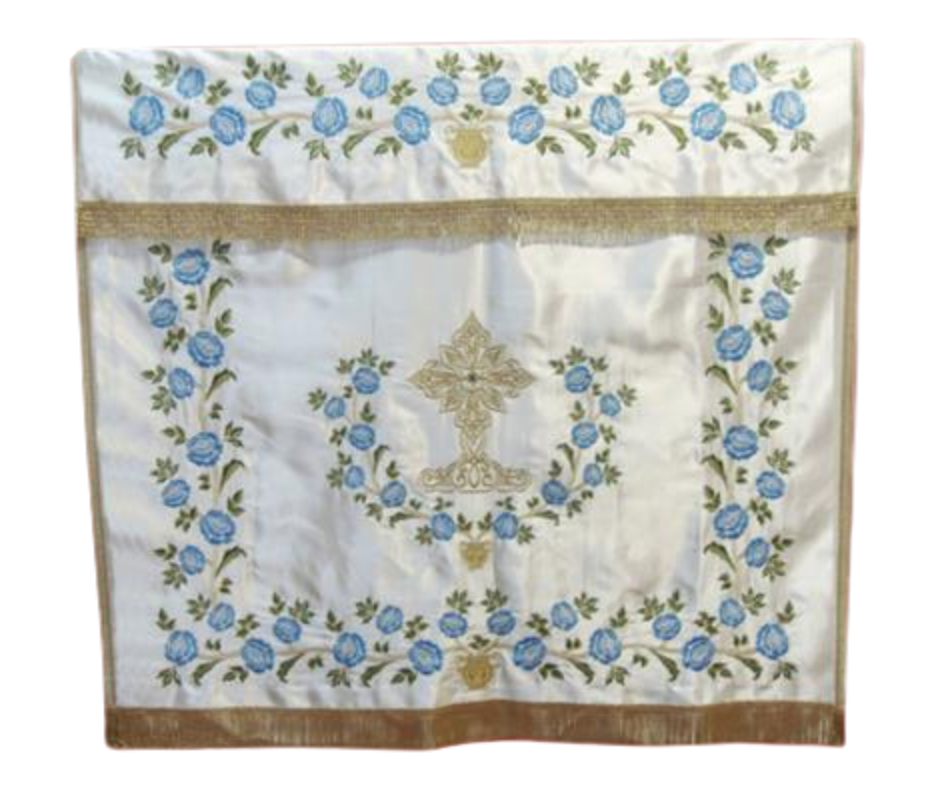 Υφασμάτινο κάλυμμα Αγίας Τράπεζας με χρυσοκέντητες λεπτομέρειες με χρυσοκλωστή και σχέδια εμπνευσμένα από την εκκλησιαστική παράδοση. Επικοινωνήστε για διαθεσιμότητα χρωμάτων και διαστάσεων. Ιδανικό για εκκλησίες και μοναστήρια, συνδυάζει ανθεκτικότητα, κομψότητα και μοναδικό σχέδιο που προσαρμόζεται τέλεια στις ανάγκες σας.
