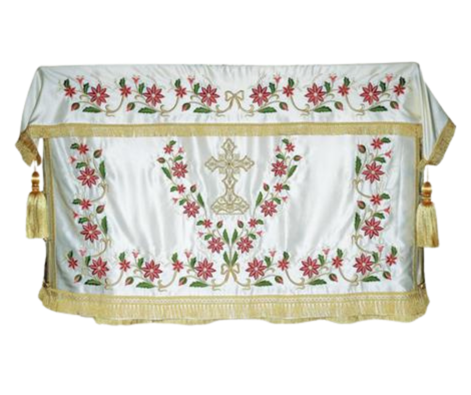 Υφασμάτινο κάλυμμα Αγίας Τράπεζας με χρυσοκέντητες λεπτομέρειες με χρυσοκλωστή και σχέδια εμπνευσμένα από την εκκλησιαστική παράδοση. Επικοινωνήστε για διαθεσιμότητα χρωμάτων και διαστάσεων.