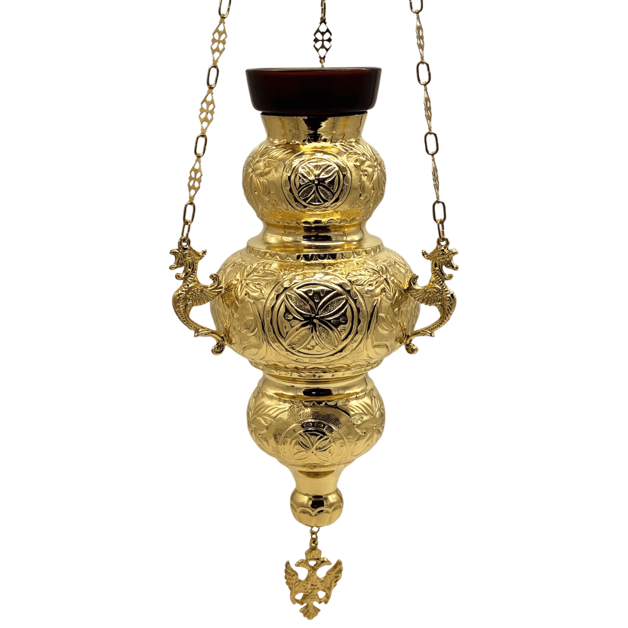 Μεταλλικό καντήλι σε χρυσό χρώμα, διακοσμημένο με μοναδικά σκαλίσματα. Διατίθεται δυνατότητα επιλογής μεταξύ τεσσάρων διαφορετικών μεγεθών, ώστε να προσαρμόζεται κατάλληλα στις ανάγκες σας.