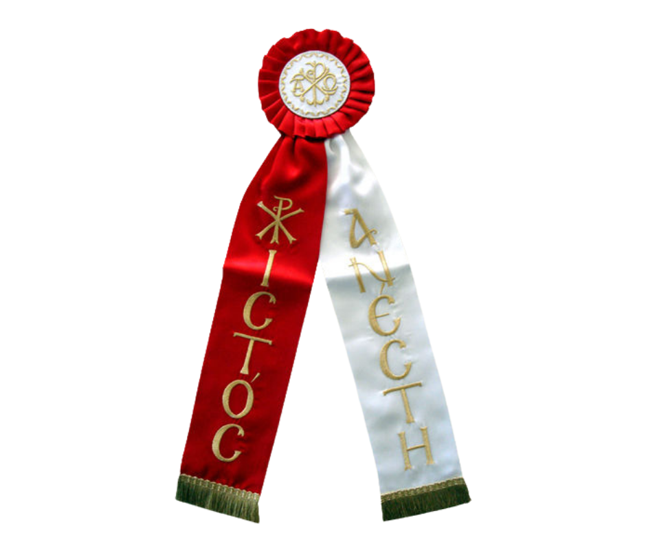 Υφασμάτινη κορδέλα στολισμού από σατέν με χρυσοκέντητες λεπτομέρειες με χρυσοκλωστή και μήνυμα “Χριστός Ανέστη”. Ιδανική για εκκλησίες και μοναστήρια, συνδυάζει ανθεκτικότητα, κομψότητα και μοναδικό σχέδιο που προσαρμόζεται τέλεια στις ανάγκες σας.