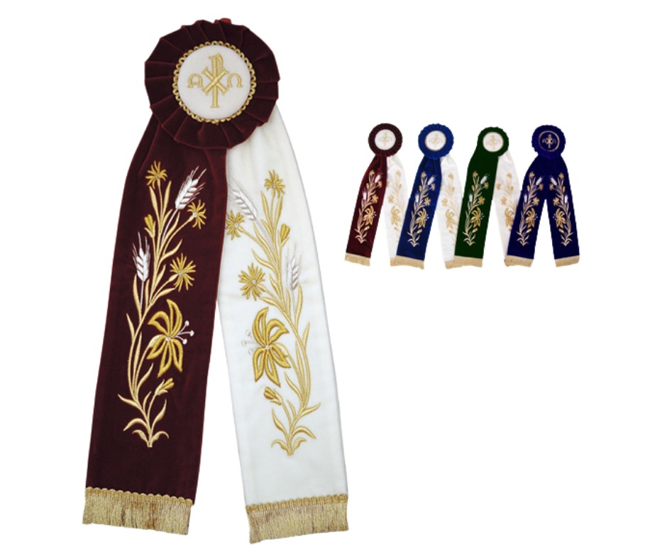 Υφασμάτινη κορδέλα στολισμού από βελούδο με χρυσοκέντητες λεπτομέρειες με χρυσοκλωστή και σχέδια εμπνευσμένα από την εκκλησιαστική παράδοση. Διατίθεται σε ποικιλία χρωμάτων. Ιδανική για εκκλησίες και μοναστήρια, συνδυάζει ανθεκτικότητα, κομψότητα και μοναδικό σχέδιο που προσαρμόζεται τέλεια στις ανάγκες σας.