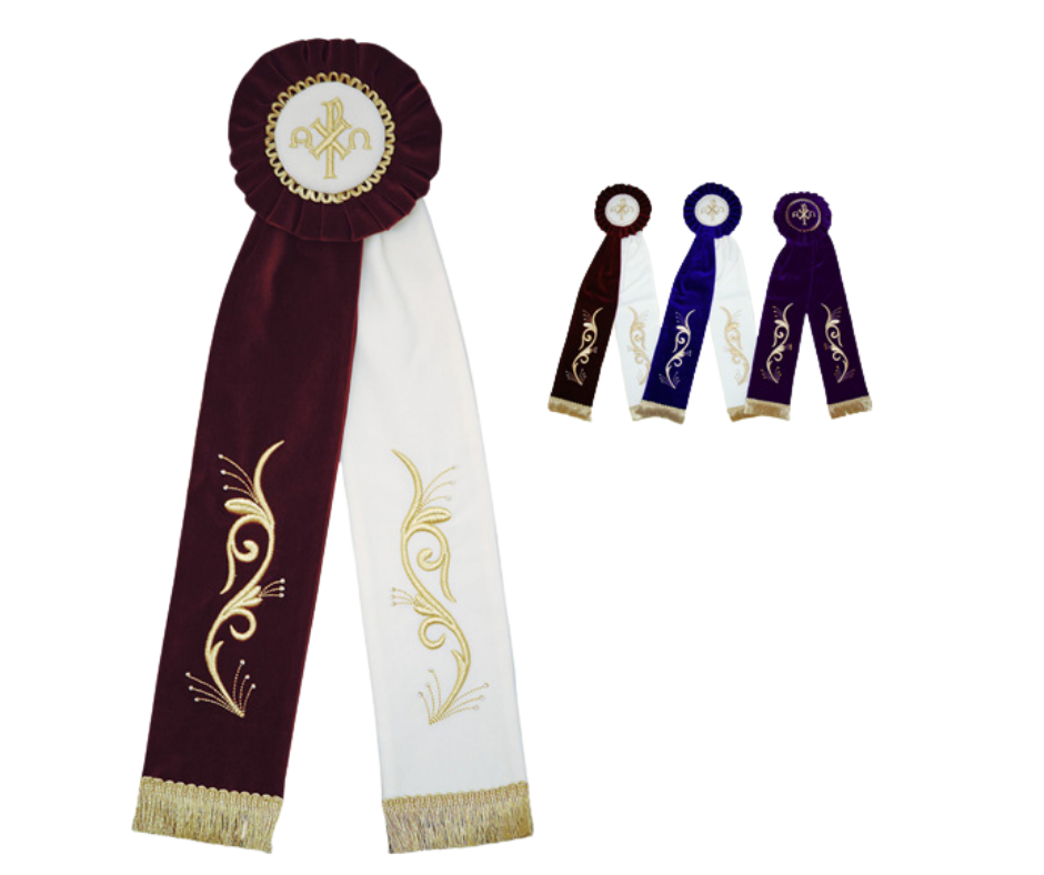 Υφασμάτινη κορδέλα στολισμού από βελούδο με χρυσοκέντητες λεπτομέρειες με χρυσοκλωστή και σχέδια εμπνευσμένα από την εκκλησιαστική παράδοση. Διατίθεται σε ποικιλία χρωμάτων.