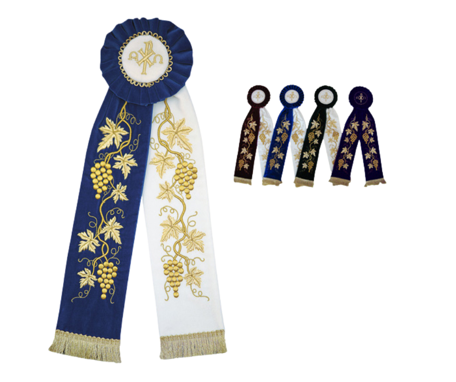 Υφασμάτινη κορδέλα στολισμού από βελούδο με χρυσοκέντητες λεπτομέρειες με χρυσοκλωστή και σχέδια εμπνευσμένα από την εκκλησιαστική παράδοση. Διατίθεται σε ποικιλία χρωμάτων.