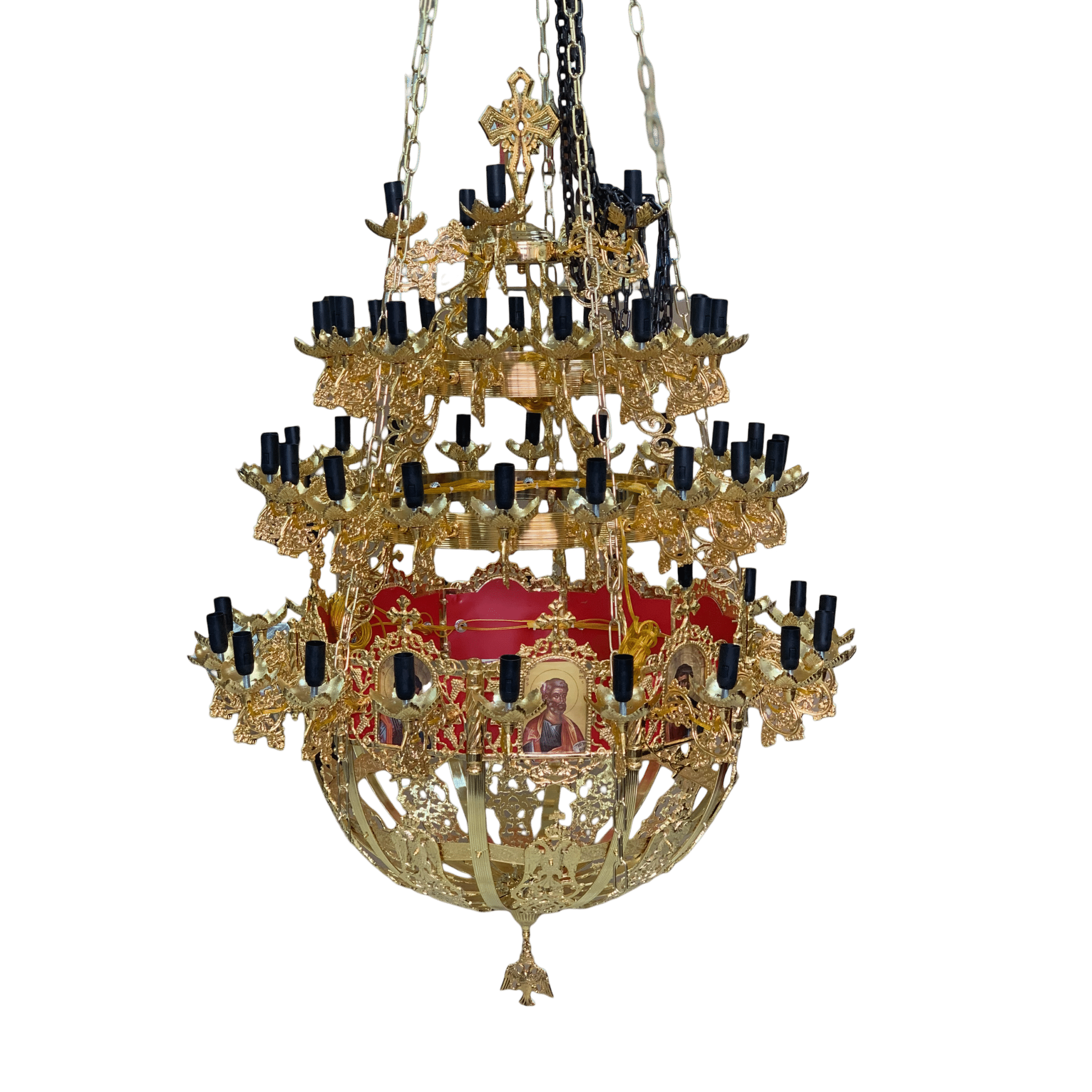 Πολυέλαιος βυζαντινός σε χρυσό χρώμα. Διατίθεται δυνατότητα επιλογής μεταξύ πέντε μεγεθών, ανάλογα με τον αριθμό των φώτων, ώστε να προσαρμόζεται κατάλληλα στις ανάγκες σας.