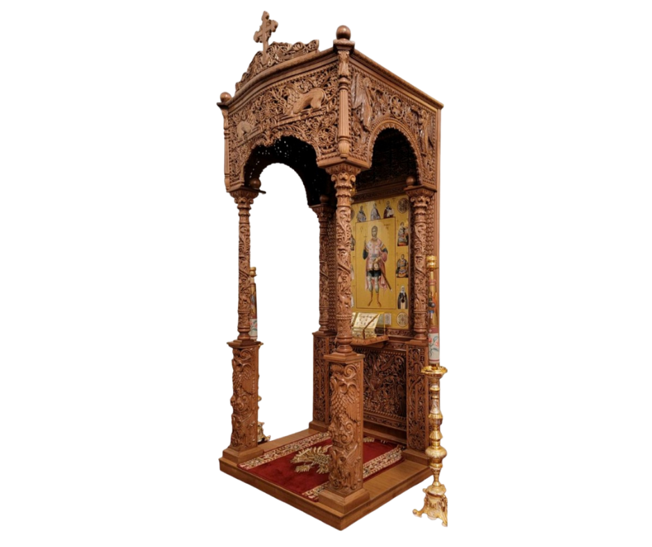 Ξυλόγλυπτο προσκυνητάρι με κιβώριο, φτιαγμένο με υψηλή τεχνοτροπία και διακοσμημένο με μοναδικά σκαλίσματα εμπνευσμένα από την εκκλησιαστική παράδοση. Ιδανικό για εκκλησίες και μοναστήρια, συνδυάζει ανθεκτικότητα, κομψότητα και μοναδικό σχέδιο που προσαρμόζεται τέλεια στις ανάγκες σας.