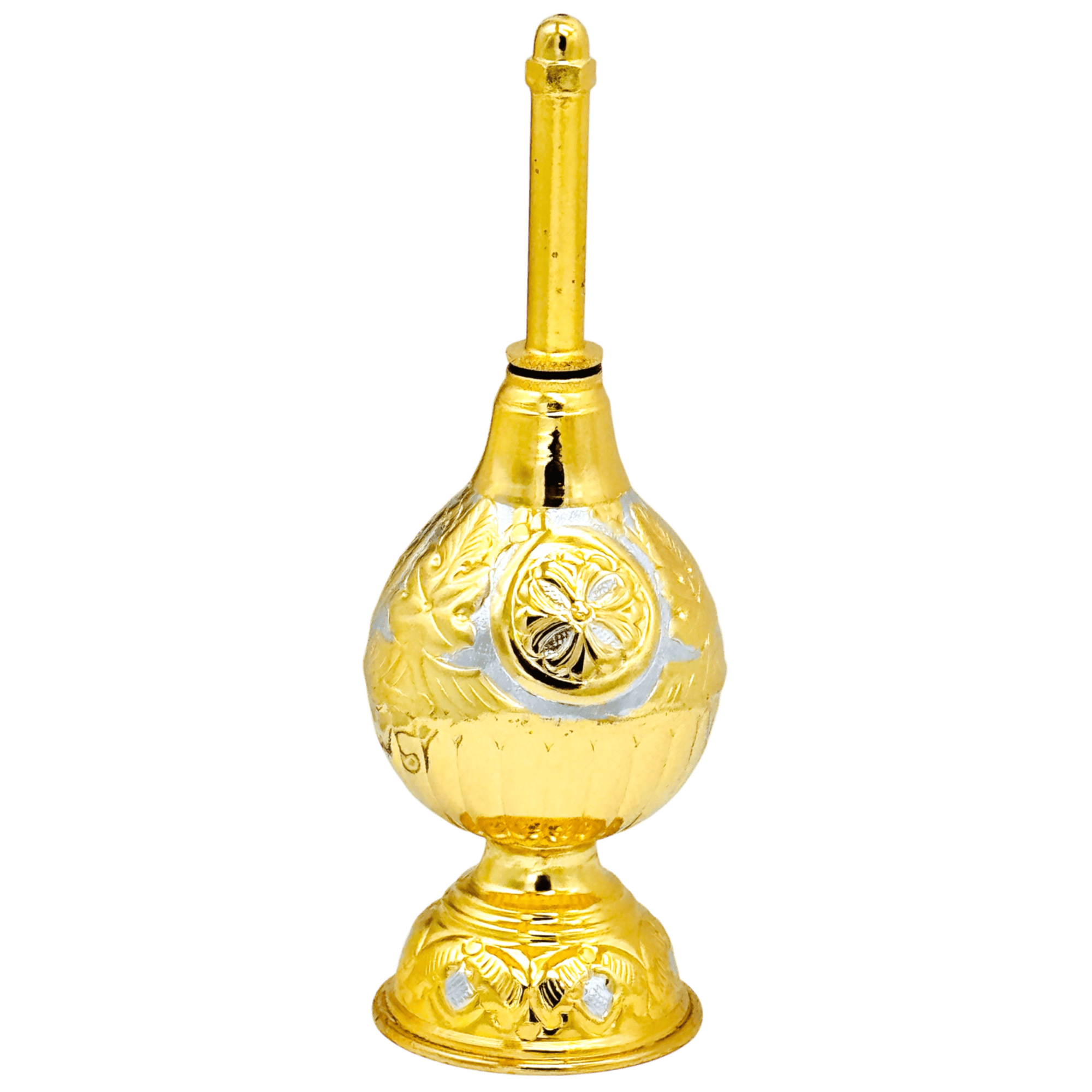 Μεταλλικό ραντιστήρι σε διχρωμία χρυσό – ασημί, διακοσμημένο με μοναδικά σκαλίσματα στο σώμα και τη βάση του.