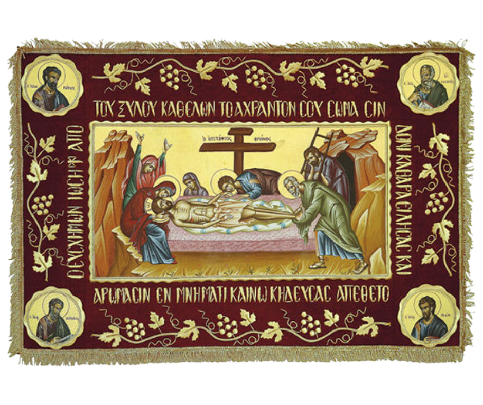 Υφασμάτινο σώμα επιταφίου από βελούδο σε κόκκινο σκούρο χρώμα, χρυσοκέντητο με χρυσοκλωστή. Διαθέσιμο σε τρία μεγέθη (70×50, 90×60, 100×65).