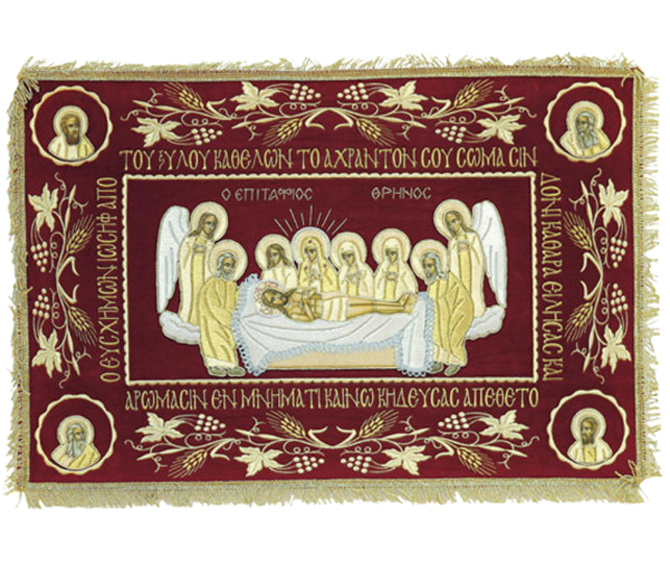 Υφασμάτινο σώμα επιταφίου από βελούδο σε κόκκινο σκούρο χρώμα, χρυσοκέντητο με χρυσοκλωστή και διακοσμημένο με παραστάσεις από τον Επιτάφιο και σχέδια εμπνευσμένα από την εκκλησιαστική παράδοση. Ιδανικό για εκκλησίες και μοναστήρια, συνδυάζει ανθεκτικότητα, κομψότητα και μοναδικό σχέδιο που προσαρμόζεται τέλεια στις ανάγκες σας.