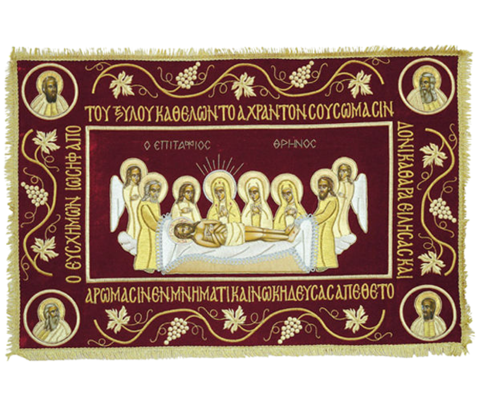Υφασμάτινο σώμα επιταφίου από βελούδο σε κόκκινο σκούρο χρώμα, χρυσοκέντητο με χρυσοκλωστή και διακοσμημένο με παραστάσεις από τον Επιτάφιο και σχέδια εμπνευσμένα από την εκκλησιαστική παράδοση. Ιδανικό για εκκλησίες και μοναστήρια, συνδυάζει ανθεκτικότητα, κομψότητα και μοναδικό σχέδιο που προσαρμόζεται τέλεια στις ανάγκες σας.