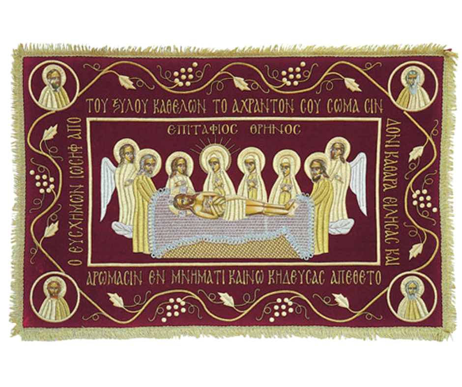 Υφασμάτινο σώμα επιταφίου από βελούδο σε κόκκινο σκούρο χρώμα, χρυσοκέντητο με χρυσοκλωστή. Διαθέσιμο σε τρία μεγέθη (70×50, 90×60, 100×65).