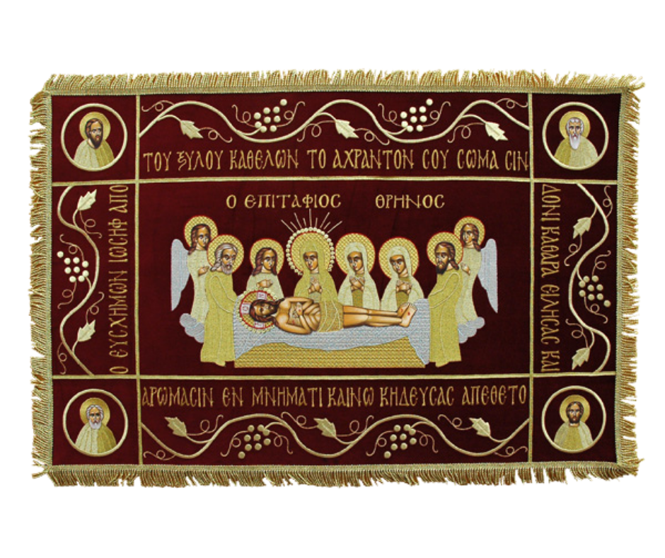 Υφασμάτινο σώμα επιταφίου από βελούδο σε κόκκινο σκούρο χρώμα, χρυσοκέντητο με χρυσοκλωστή. Διαθέσιμο σε τρία μεγέθη (70×50, 90×60, 100×65).