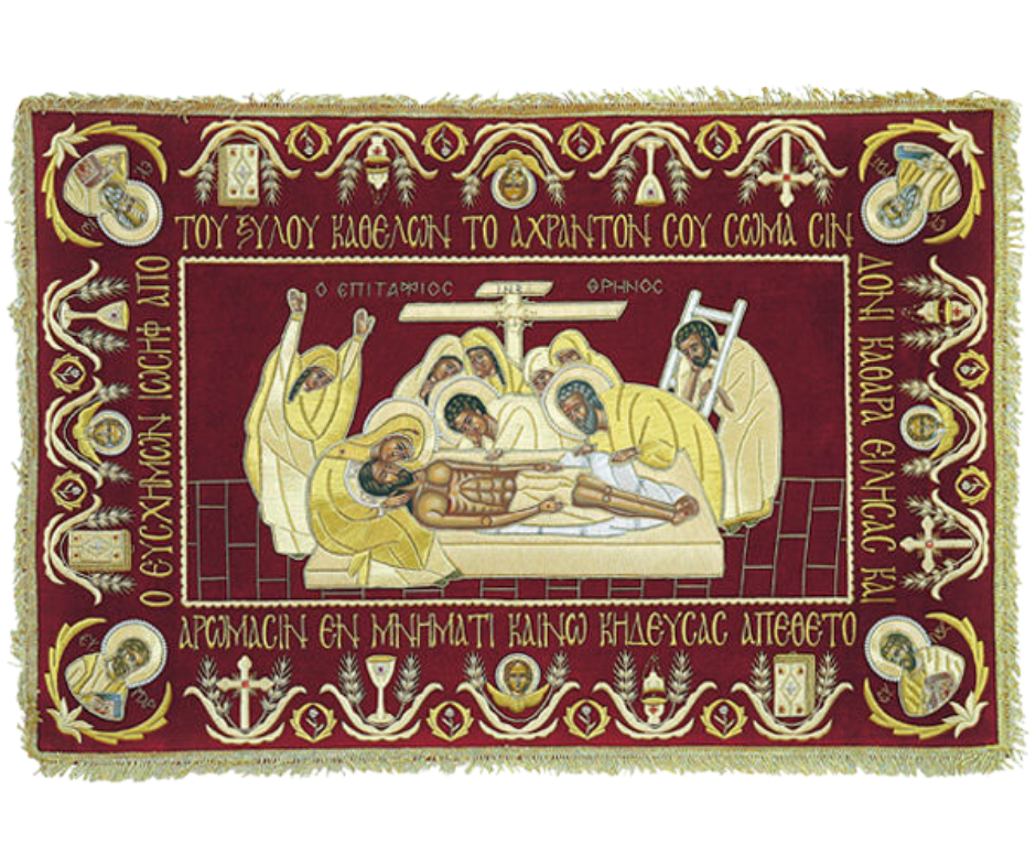Υφασμάτινο σώμα επιταφίου από βελούδο σε κόκκινο σκούρο χρώμα, χρυσοκέντητο με χρυσοκλωστή. Διαθέσιμο σε ένα μέγεθος (100×65).