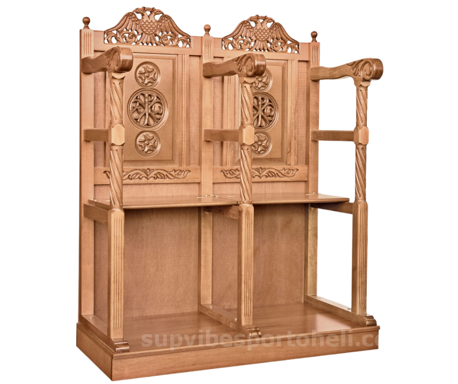 Ξυλόγλυπτα στασίδια διπλά, φτιαγμένα με υψηλή τεχνοτροπία και διακοσμημένα με μοναδικά σκαλίσματα με δικέφαλο αετό και μαργαρίτα. Ιδανικά για εκκλησίες και μοναστήρια, συνδυάζει ανθεκτικότητα, κομψότητα και μοναδικό σχέδιο που προσαρμόζεται τέλεια στις ανάγκες σας.