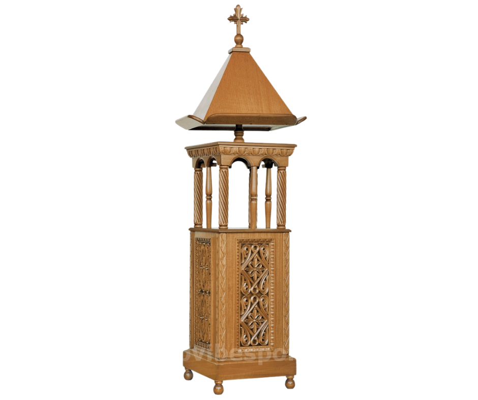 Ξυλόγλυπτη στήλη αναλογίου τετράγωνη, φτιαγμένη με υψηλή τεχνοτροπία και διακοσμημένη με μοναδικά σκαλίσματα εμπνευσμένα από την εκκλησιαστική παράδοση. Ιδανική για εκκλησίες και μοναστήρια, συνδυάζει ανθεκτικότητα, κομψότητα και μοναδικό σχέδιο που προσαρμόζεται τέλεια στις ανάγκες σας.