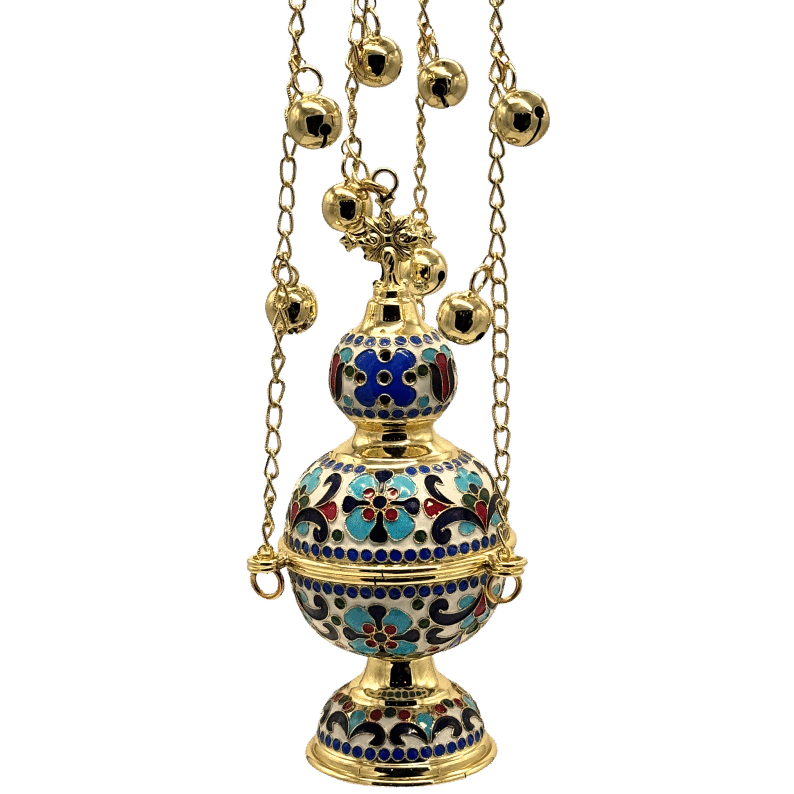 Μεταλλικό θυμιατό σε χρυσό χρώμα, διακοσμημένο με χειροποίητο σκαλιστό πολύχρωμο σμάλτο.