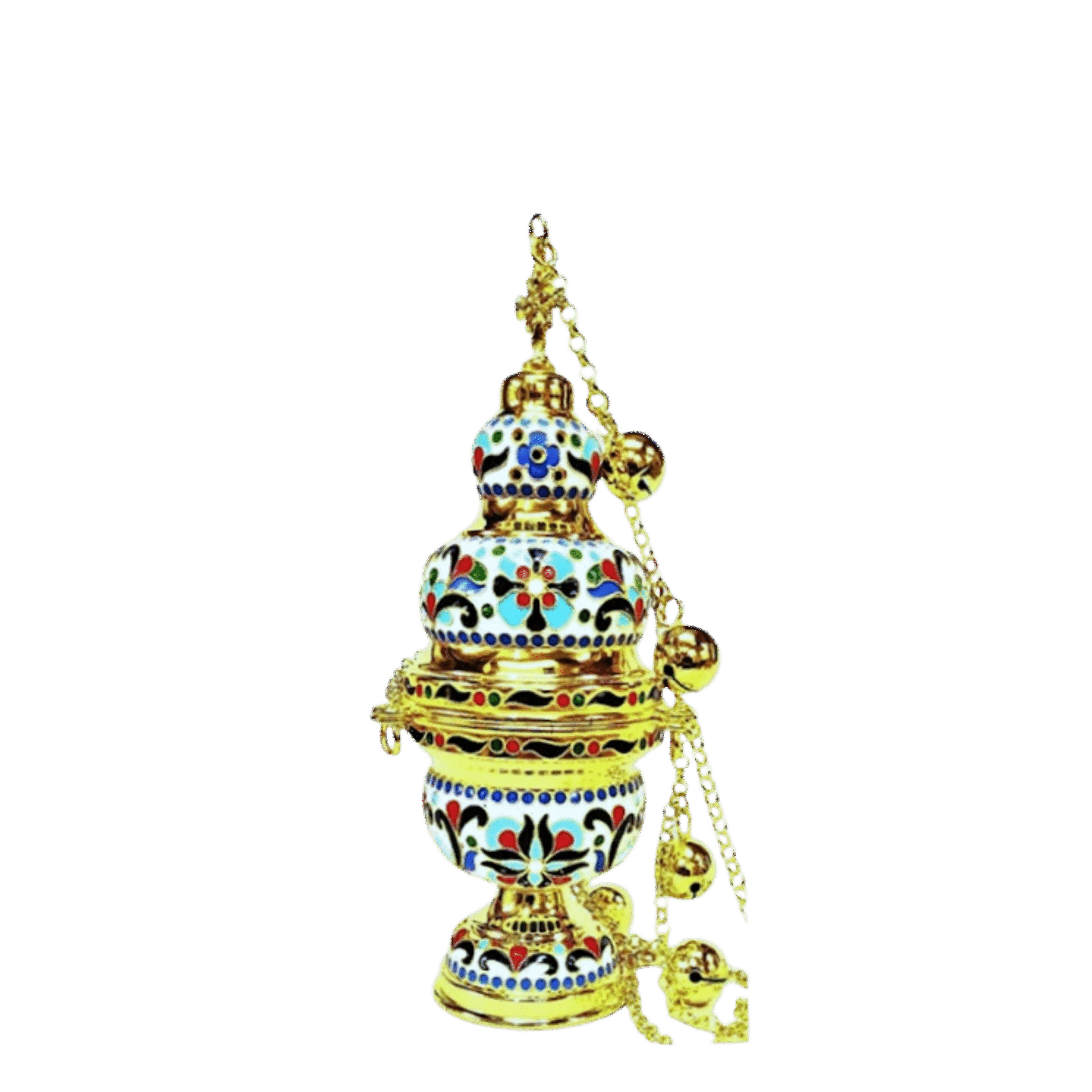 Μεταλλικό θυμιατό σε χρυσό χρώμα, διακοσμημένο με χειροποίητο σκαλιστό πολύχρωμο σμάλτο.